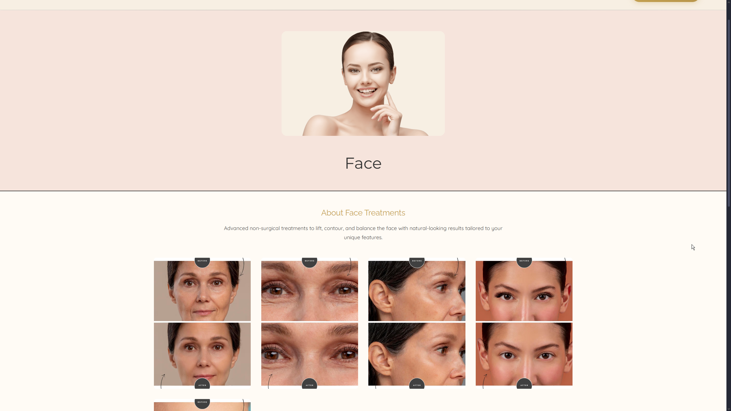 Beautiful service pages showcasing various skincare treatments with detailed descriptions, pricing information, and treatment duration for all services.